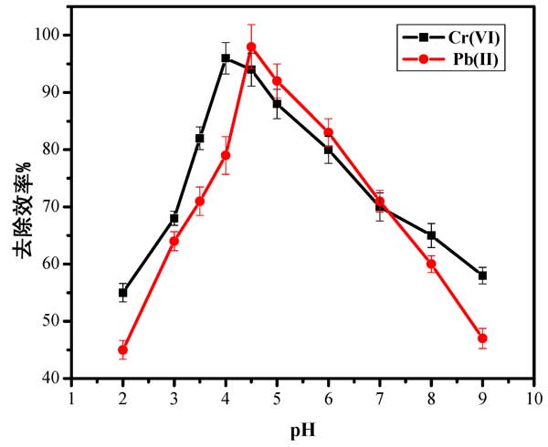 pH的影響:系統(tǒng)的吸附效率在很大程度上取決于溶液的pH值。圖2中顯示的數(shù)據(jù)突出顯示了pH值對Pb(II)和Cr(VI)離子在活性炭上的吸附的影響。在pH 4.6和4下,Pb(II)和Cr(VI)的吸附增加并達(dá)到最大值。pH值高于6時,吸附活性降低。這可以歸因于游離離子的減少是由于在較高的pH范圍內(nèi)形成羥基配合物,金屬離子隨后沉淀。因此,去除效率急劇下降。另一方面,在低于合適pH的pH值下,H+和金屬離子爭奪活性炭表面上相同活性位點上的相同活性位點可能會阻礙吸附活性。