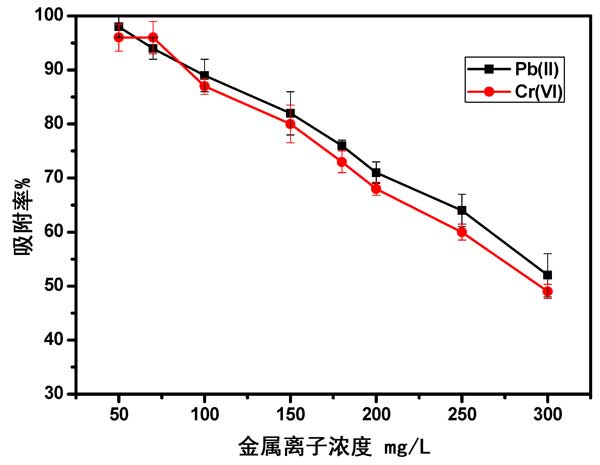 金屬離子濃度的影響:使用0.80 g和1.00 g的活性炭在50至300 mg/L的各種濃度的Pb(II)和Cr(VI)濃度下進(jìn)行Pb(II)和Cr(VI)離子的吸附。圖3中的結(jié)果表明,Pb(II)和Cr(VI)離子的最大吸附量分別為50和70 mg/L。這可以歸因于以下事實:隨著濃度的增加,活性部位被覆蓋并飽和。