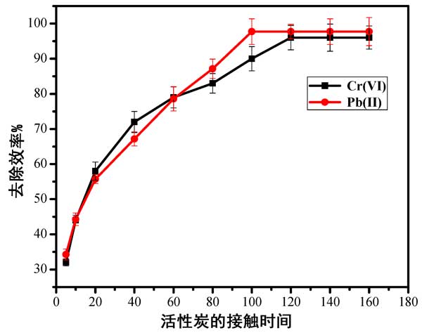 接觸時間的影響:使用較早獲得的合適活性炭劑量為0.80和1.0 g/100 mL,研究了接觸時間對Pb(II)和Cr(VI)離子在活性炭上吸附的影響。實驗是在25°C的合適金屬離子濃度值下進(jìn)行的。Pb(II)和Cr(VI)離子分別為50.0和70.0 mg/L。如圖4所示,所研究的金屬在100和120分鐘后的最大去除效率達(dá)到98%和96%。而且,接觸時間的進(jìn)一步增加對兩種金屬離子的去除沒有顯著影響。