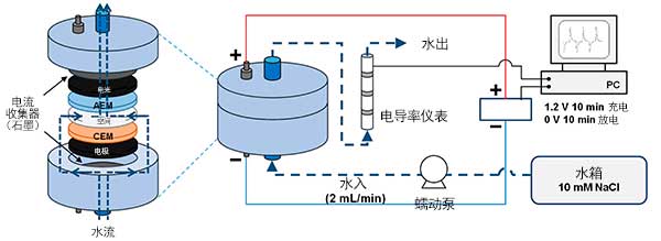 方案1中描述了用于檢查脫鹽性能的膜電容去離子系統(tǒng)。每個電極由作為集電器的石墨,交流電極和IEM組成。將陰離子交換膜和陽離子交換膜分別放在陽極和陰極上。一對電極由厚度為110 µm的尼龍墊片隔開。使用蠕動泵將進(jìn)料水供應(yīng)到電解池。處理后的溶液直接流過電導(dǎo)率儀,隨后使用單程模式。除了IEM的存在外,還以與電容去離子中使用的相同配置進(jìn)行了CDI實驗。使用電池循環(huán)器在1點(diǎn)分別施加電壓10分鐘。在充電步驟中為2 V,在放電步驟中為0V。從第三個循環(huán)獲得數(shù)據(jù),并從至少三個操作中計算出平均值,以實現(xiàn)可重復(fù)性。