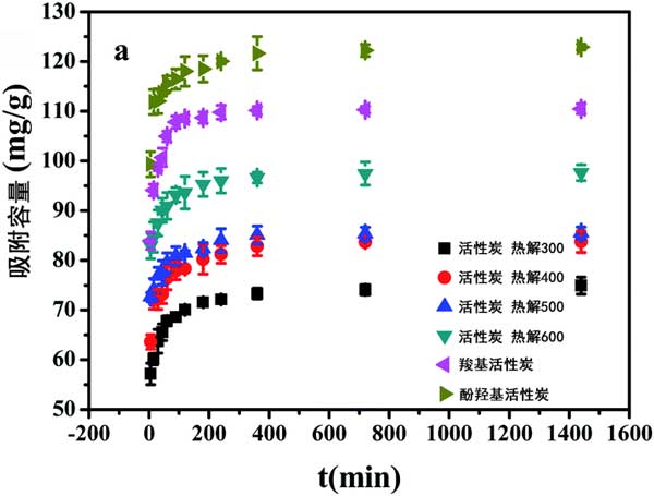 大量研究表明,有機(jī)污染物在水介質(zhì)上的吸附包括分配和吸附作用。為了評估在活性炭上吸附化合物時在碳化相中的吸附和在非碳化相中的分配的貢獻(xiàn),雙模式模型在該研究領(lǐng)域中被成功引用。通過雙模式模型計算了多菌靈在不同濃度的活性炭上的分配和吸附。在該實(shí)驗(yàn)中,雙模型為所有樣品的等溫線提供了良好的擬合(圖3)。在本研究中,所有活性炭上多菌靈的吸附均大于分配所有多菌靈濃度的吸附。但是,隨著多菌靈濃度的增加,分配(Q p)和吸附(Q ad)對總吸附的貢獻(xiàn)也不同。在低濃度范圍內(nèi),吸附大于在活性炭上的分配,并且Q ad值貢獻(xiàn)超過總吸附的97%。但是,在高濃度范圍內(nèi),多菌靈對不同樣品在整體吸附中的分配和吸附的貢獻(xiàn)不同。當(dāng)多菌靈的濃度達(dá)到300 mg L-1時在熱解300、400、500攝氏度的活性炭上,吸附對總吸附的貢獻(xiàn)仍然遠(yuǎn)遠(yuǎn)大于分配作用。盡管活性炭中含O官能團(tuán)的含量逐漸減少,但分配對總吸附的貢獻(xiàn)率卻逐漸增加,特別是對于羧基活性炭和酚羥基活性炭,它們的Q p值分別達(dá)到39.4%和44.13%。主要原因可能是樣品表面上含O官能團(tuán)的減少導(dǎo)致更好地暴露于樣品表面和多菌靈濃度增加,從而導(dǎo)致吸附過程飽和。因此,多菌靈可以分配給非碳化相。