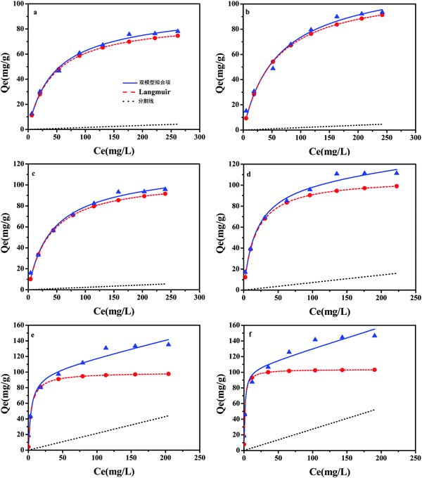 圖3:通過雙模型吸附模型擬合的活性炭吸附多菌靈等溫線。
