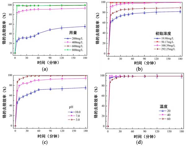 如在示出的圖4中的a,b中,活性炭中的nZVI劑量和初始濃度對總鉻的去除動力學顯著影響。初始去除率隨著活性炭復合材料劑量的增加或初始濃度的降低而逐漸增加,因為提供了足夠的nZVI活性位與鉻反應。