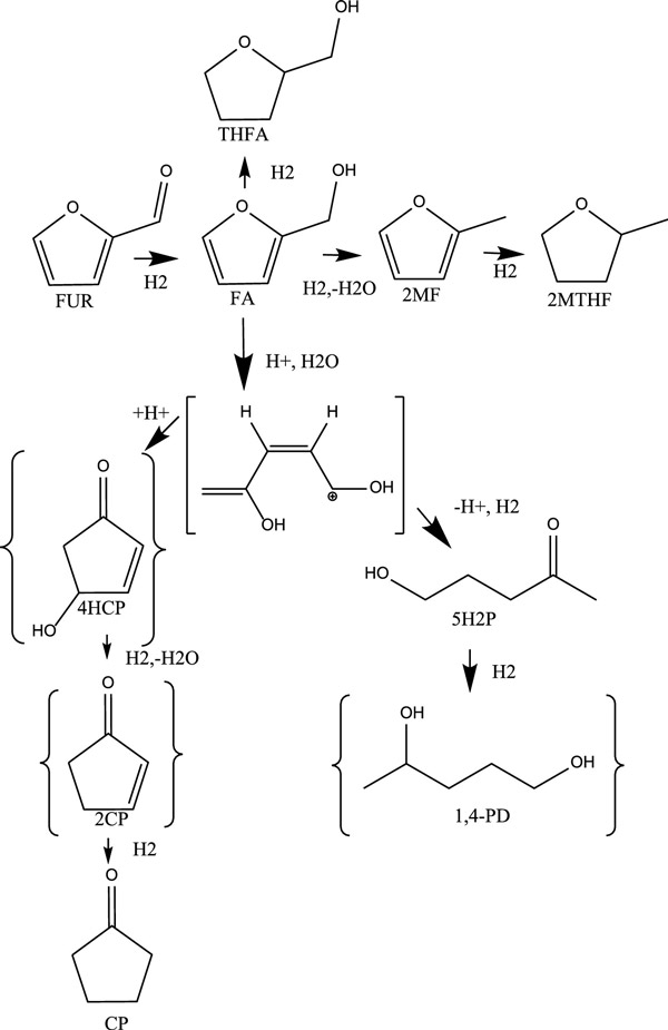在下一組實驗中,確定了液體停留時間對糠醛加氫超過0.8%活性炭催化劑的影響(H 2氣流保持恒定在100 mL/min)。糠醛轉(zhuǎn)化率隨著液時空速的增加或停留時間的縮短而下降,碳封閉率在74%至100%之間。溫度,壓力和液體停留時間效應研究的結(jié)果表明,活性炭催化劑主要通過糠醛促進了糠醛中糠醇和2-甲基呋喃的形成,并通過推測性反應途徑促進了環(huán)戊酮和5-羥基-2-戊酮的少量形成,需要對酮進行酸催化)形成(圖3)。