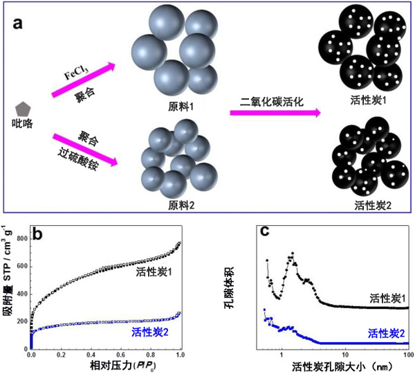 圖1和一個(gè)示出了活性炭材料的制備方法。首先,使用不同的氧化劑(FeCl 3和過(guò)硫酸銨)通過(guò)吡咯單體的氧化聚合反應(yīng)合成了兩種樣品。其次,對(duì)原材料進(jìn)行二氧化碳活化處理,以制備具有高孔隙率的活性炭。進(jìn)行氮吸附測(cè)量以獲取關(guān)于他們的比表面積的數(shù)據(jù)。