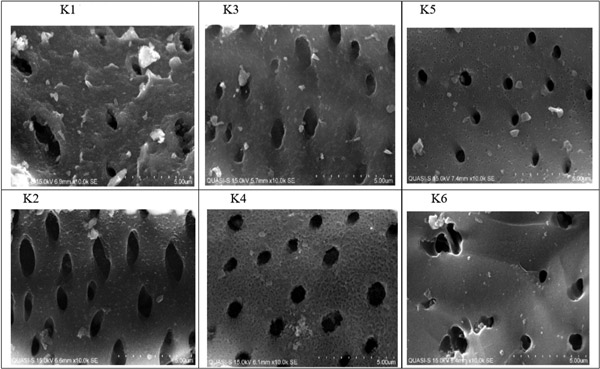 對原始活性炭(圖3中的K1)的掃描顯示出相當均勻的孔;钚蕴康慕Y構可以看作是薄片,為不規(guī)則分布和各種尺寸的孔提供了較大的吸附面積。表面上的大多數(shù)可見孔都在5微米范圍內,這與對椰殼活性炭的預期一致,而在這5微米孔內可以看到小于1微米的較小孔。圖3中的K2顯示了在氯酸鹽吸附到表面活性部位后活性炭表面的變化。這些孔有變化的跡象,因為其中一些吸附氯酸鹽,而其他孔被氯酸鹽和氯化物分子阻塞。在10,000倍的放大倍率下,可以觀察到小孔周圍和大孔入口處的沉積,因為預計表面活性基團會大量存在于這些區(qū)域;钚蕴康乃嵝栽偕鷺O有可能形成了表面活性部位,從而增強了活性炭吸附大量氯酸鹽的能力。