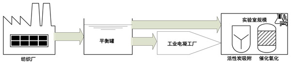 來(lái)自紡織廠的紡織廢水被存儲(chǔ)在均衡罐中,并轉(zhuǎn)移到工業(yè)規(guī)模的電凝處理廠。此后,如圖1所示,在實(shí)驗(yàn)室中進(jìn)行了催化臭氧氧化,然后進(jìn)行了吸附階段。單次吸附:在催化臭氧氧化之前,對(duì)于所有催化劑,吸附實(shí)驗(yàn)均進(jìn)行了30分鐘。將活性炭催化劑直接添加到廢水中。吸附在與臭氧化處理相同的反應(yīng)器中進(jìn)行,但沒(méi)有臭氧入口以維持均勻的實(shí)驗(yàn)條件。所有實(shí)驗(yàn)條件與臭氧化處理期間相同。溫度保持穩(wěn)定并且等于23±1℃。活性炭催化臭氧化:使用與吸附和臭氧化相同的反應(yīng)器進(jìn)行催化臭氧化。所有實(shí)驗(yàn)條件與臭氧化處理期間相同。對(duì)于所有催化劑,每次催化劑濃度為0.5g/L。反應(yīng)后,進(jìn)行催化劑的過(guò)濾(0.45μm過(guò)濾器)。