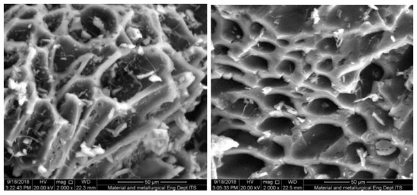 通常,由碳化過程形成的活性炭具有粗糙的表面結(jié)構(gòu),其孔徑不會(huì)太大以至于會(huì)影響吸附能力(圖1)。粒度和表面積對(duì)吸附劑很重要,因?yàn)榱6葧?huì)影響吸附能力。由該圖可知,通過RSS碳化處理得到的活性炭的孔徑為40μm左右,未改性,使用活化液進(jìn)行改性后,為<20μm。這表明,活化液的浸漬在孔的形成中起著重要的作用。促進(jìn)更多的孔隙形成?偙砻娣e影響總吸附容量,從而提高吸附劑去除廢水中有機(jī)化合物的效率。