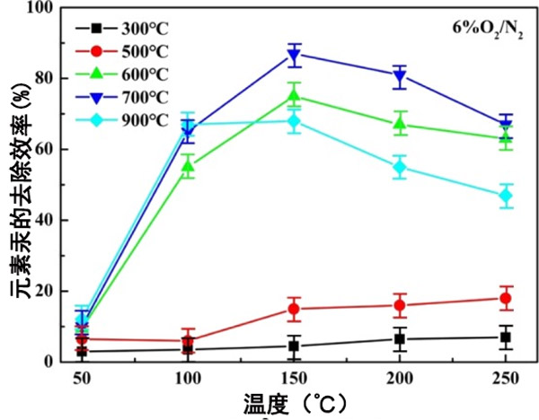 對于活性炭吸附煙氣中的元素汞。除汞測試表明,熱解溫度為700°C時(shí),活性炭的除汞效率為86%。氧氣的存在促進(jìn)了元素汞的去除。當(dāng)熱解溫度升至900°C時(shí),活性炭趨于團(tuán)聚,導(dǎo)致結(jié)晶相粒徑急劇增加,從而抑制了元素汞的去除。但在更高的熱解溫度下會增加。活性炭的BET表面非常差,當(dāng)熱解溫度不高于500°C時(shí),幾乎不會產(chǎn)生鈷元素,導(dǎo)致除汞效率低。無論如何,活性炭可以用于吸附去除元素汞,而不是通過化學(xué)改性添加鈷,從而可以在燃煤煙氣中去除汞。