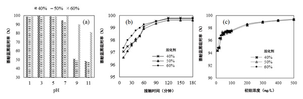 溶液PH影響活性炭的表面電荷。因此,它是控制活性炭吸附過(guò)程的重要因素之一。圖2(a)中描述了萘酚藍(lán)黑在以40%,50%和60%的活化劑制備的活性炭上的吸附。在所研究的pH范圍內(nèi)(pH介于1和11之間),萘酚藍(lán)黑在活性炭上的吸附是pH依賴性的,尤其是在pH 5和11之間。在低pH值下,活性炭表面帶有凈正電荷。pH的增加導(dǎo)致凈正電荷的減少和凈負(fù)電荷的增加。萘酚藍(lán)黑是具有負(fù)電荷的陰離子染料。在pH值為3時(shí),它會(huì)在活性炭表面的活性位點(diǎn)(即,官能團(tuán))與被吸附物分子(即,萘酚藍(lán)黑)之間引起靜電吸引。活性炭的活性部位與萘酚藍(lán)黑色分子之間的靜電排斥作用占主導(dǎo)。因此,可以得出結(jié)論,將萘酚藍(lán)黑色吸附到活性炭上的pH值選擇為3。另一方面,使用60%活化劑的活性炭吸附時(shí),萘酚藍(lán)黑的吸附量比使用40%活化劑活化的活性炭吸附的高,這是由于活性炭產(chǎn)生了更多的孔,盡管在pH 1-3下差異不明顯。