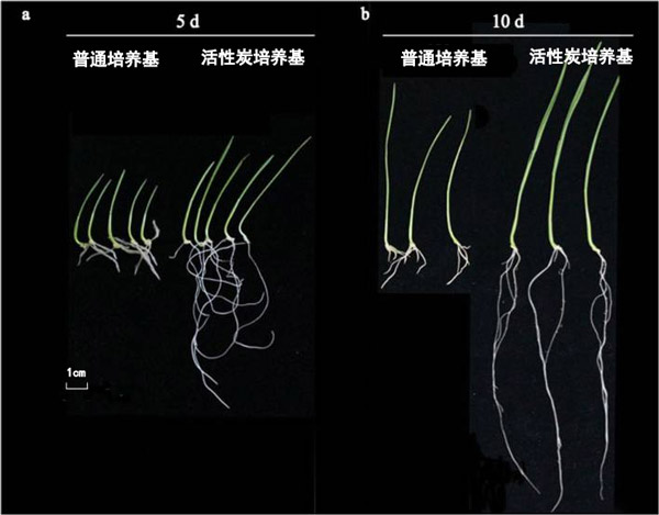 圖1:圖像顯示在活性炭或普通培養(yǎng)基中生長5天(a)或10天(b)的小麥幼苗。