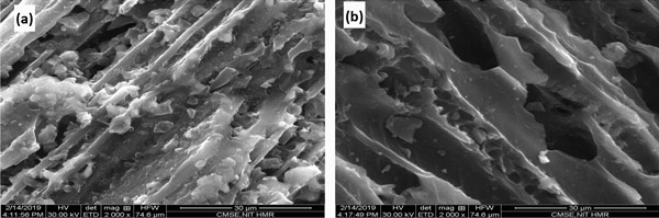 進(jìn)行了近距離分析以活性炭的基礎(chǔ)性質(zhì)。它包括水分的百分比,揮發(fā)物的百分比,灰分的量以及有機(jī)材料中可用的固定碳。再通過SEM檢測(cè)強(qiáng)電子束轟擊活性炭樣本時(shí)從樣本表面散射的電子來幫助分析詳細(xì)的高分辨率表面圖像。與SEM一起,EDS可以通過深入分析其表面來極大地幫助獲取有關(guān)特定樣品所含化學(xué)物質(zhì)的信息。在本次測(cè)試中,通過使用SEM和EDS,分析了在吸附機(jī)理過程中氟吸收前后的活性炭。它有助于理解紋理形態(tài)及其在吸附中的意義。數(shù)據(jù)如圖1所示。結(jié)果表明,在氟化物吸附之前,活性炭表面具有大量的粗糙度,隨后在氟化物吸收中會(huì)降低,并使表面光滑并降低了孔隙率。