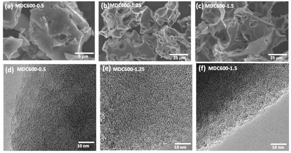 活性炭吸附劑是通過(guò)兩步熱解過(guò)程制備的,該過(guò)程包括將奶粉轉(zhuǎn)化為生物炭,然后在高溫下用堿活化。同時(shí)還增加了細(xì)微的差別,即涉及一種輔助化學(xué)或物理試劑,可在材料上蝕刻出納米級(jí)的孔隙。牛奶由多種蛋白質(zhì),脂肪和礦物質(zhì)組成。有特別地酪蛋白蛋白(一種磷酸蛋白家族)以膠束的形式存在于牛奶中,通過(guò)疏水相互作用,氫鍵結(jié)合以及膠束核心內(nèi)磷酸鈣納米簇的橋接而在內(nèi)部得到穩(wěn)定。圖1正是這些磷酸鈣-酪蛋白蛋白簇充當(dāng)碳的3D結(jié)構(gòu)發(fā)展的模板,因?yàn)樗鼈冊(cè)跓峤獾某跏茧A段得以保存,在此階段奶粉被加熱到400°C,并防止活性炭?jī)?nèi)結(jié)構(gòu)塌陷。在第二個(gè)活化步驟中,堿KOH與碳反應(yīng)生成碳酸鉀,碳酸鉀分解并留下富氮和富氧的微孔。所得的活性炭顯示出有效且可逆地捕集二氧化碳,同時(shí)排除了水蒸氣。