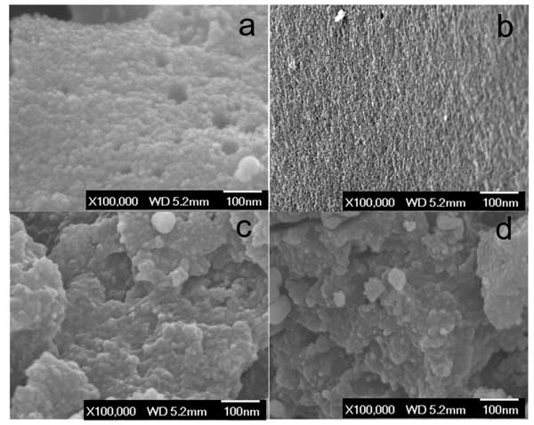 首先是電子顯微鏡,圖1顯示了活性炭(a),高溫活化后的活性炭(b),鎢浸漬活性炭(c)和鎢浸漬活性炭載鉑催化劑(d)的形態(tài)。SEM圖像(圖1a)顯示了在CO 2氣氛下在800℃下氣化的固體炭的形態(tài)。其多孔表面是由高溫下的CO 2蝕刻過程所貢獻的。高溫活化后的活性炭變得高度多孔,在1000°C碳化后,炭中形成了更多的孔和通道(圖2b)。鎢浸漬活性炭樣品中原始的活性炭結(jié)構似乎消失了(圖1c),因為在高溫下活性炭和氧化鎢之間的碳熱還原反應破壞了活性炭結(jié)構;钚蕴康谋诒砻媲度肓酥睆皆3到10 nm之間的納米粒子(圖1c),根據(jù)XRD結(jié)果,這意味著這些納米粒子應為碳化鎢結(jié)構。在鎢浸漬活性炭樣品中加入1.0%鉑后,表面形態(tài)無明顯變化(圖1d)。