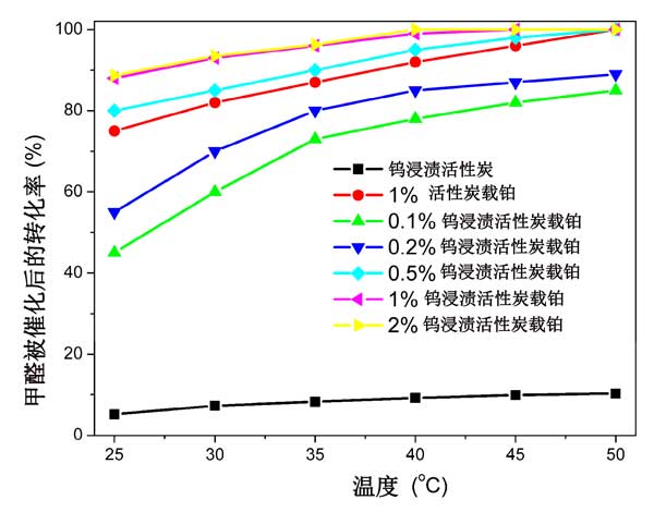 圖2:使用不同的鉑負載活性炭催化劑,反應溫度對甲醛轉(zhuǎn)化率的影響。