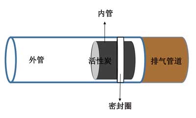 模擬的測試環(huán)境包含內(nèi)部和外部兩部分的試管進(jìn)行吸附。外管的長度為50cm,直徑為3.8cm。該管的功能是將排氣消聲器連接至氣體分析儀,而內(nèi)管則用作活性炭的儲(chǔ)存器。改變內(nèi)管的長度,以確定活性炭負(fù)載百分比對降低廢氣濃度的影響。直徑分別為3cm,4cm和5cm。管子之間有一個(gè)密封,以防止廢氣泄漏。管的結(jié)構(gòu)在圖1中進(jìn)行了描述。