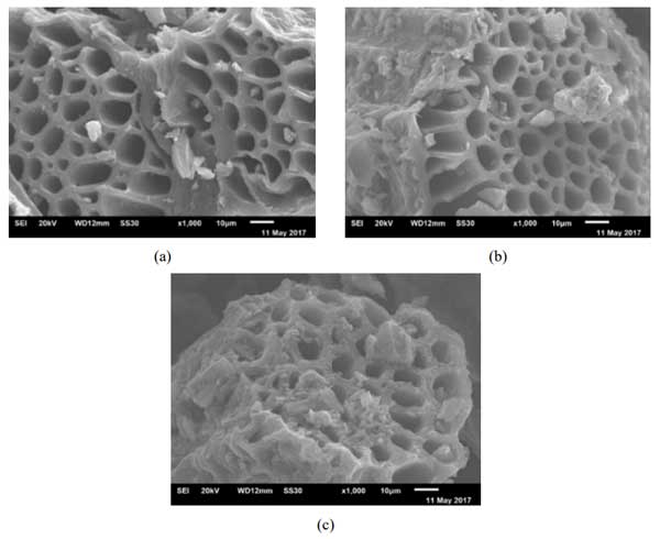 由氧化鎂改性的活性炭具有清晰且?guī)缀蹙鶆虻目捉Y(jié)構(gòu)。氧化鎂的存在會(huì)導(dǎo)致碳孔隙率降低,因此,由于活性炭的孔膨脹,孔之間的距離會(huì)更大。結(jié)果,產(chǎn)生的孔的數(shù)量將增加并且導(dǎo)致表面積增加。使用SEM對活性炭進(jìn)行表征,以觀察吸附劑的圖案或表面結(jié)構(gòu)。進(jìn)行了研究中的SEM表征,以確定使用由氧化鎂改性活性炭形成的孔隙條件。