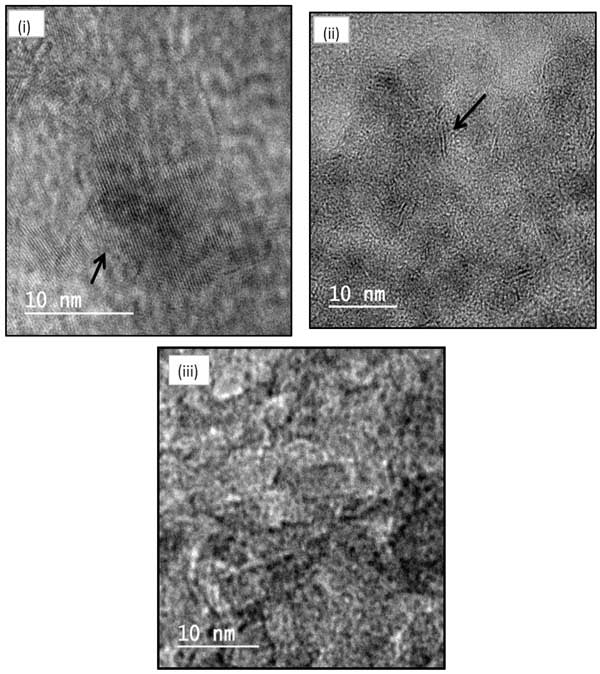 進(jìn)行了鎳鉬硫化催化劑的TEM分析,以收集有關(guān)硫化鉬在載體上的分散性的信息。TEM圖像如圖1所示。對(duì)于氧化鋁和活性炭催化劑,在二氧化硅催化劑中未觀察到MoS 2條紋。氧化鋁催化劑中會(huì)明顯出現(xiàn)兩到三層MoS 2堆疊,可能是II型活性位。然而,這種類型的活性位點(diǎn)對(duì)于活性炭負(fù)載的催化劑是不可見(jiàn)的。氧化鋁催化劑的計(jì)算平均平板長(zhǎng)度為3.19nm。較大的平均平板長(zhǎng)度可能與氧化鋁催化劑中較弱的金屬-載體相互作用有關(guān)。