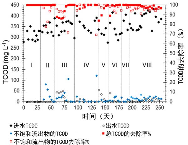 圖2:進水中不飽和廢水和總廢水中總化學(xué)需氧量的濃度以及兩種廢水中的去除百分率隨活性炭運行時間的變化(d)。