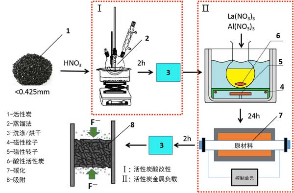 鑭鋁改性活性炭的制備包括兩個步驟:酸改性過程(I)和鑭-鋁加載過程(II)。方法I涉及特定質(zhì)量分?jǐn)?shù)的硝酸(HNO3)。將HNO3和活性炭混合在燒瓶中,將燒瓶置于75°C的恒溫水浴中保持2小時。然后,將活性炭洗滌至中性并在100℃下干燥3小時,從而獲得酸改性的活性炭。用鑭(NO3)3·2H2O和鋁(NO3)3加載鑭和鋁的酸改性活性炭。將10g酸改性活性炭在100mL鑭(NO3)3·2H2O和鋁(NO3)3的混合溶液中攪拌24小時。然后,將固體產(chǎn)物在氮?dú)庀掠?00°C的管式爐中碳化兩小時,冷卻至室溫后,完成鑭鋁改性活性炭,制備和吸附過程示意圖如圖1所示。鑭鋁改性活性炭將用作氟化物的吸附劑。