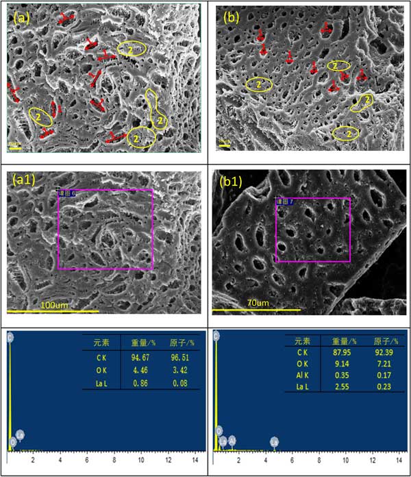 通過掃描電子顯微鏡(SEM)來顯示樣品的微觀形態(tài)和相應(yīng)的能量色散光譜(EDS)圖像,以證明鑭或鋁在兩種金屬上的成功加載的活性炭,在合適條件下制備。鑭改性活性炭和鑭鋁改性活性炭的SEM圖像如圖2所示。在圖2a中,有許多橢圓形孔標(biāo)記為1。鑭改性活性炭的表面較粗糙,而較細(xì)的多孔結(jié)構(gòu)則標(biāo)記為2。但是,鑭鋁改性活性炭的孔結(jié)構(gòu)在圖3b中進(jìn)行了更改。標(biāo)記為1的孔結(jié)構(gòu)變得更規(guī)則圓,標(biāo)記為2的細(xì)孔尺寸變大,并且孔分布更均勻,這適合更好的吸附能力。從圖2a1,a2和b1,b2中的樣品中檢測到元素鑭和鋁的存在。鑭的重量百分比為0.86%,經(jīng)過鑭(NO3)3·2H2O和率(NO3)3的改性后,明顯增加至2.55%。更多鑭的含量將顯示出更好的吸附性能,這可能是由于兩種元素在改性過程中的協(xié)同作用所致。