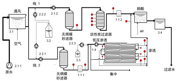 半技術(shù)試驗(yàn)工廠安裝了電氣安裝,工廠控制和數(shù)據(jù)管理。中試工廠由兩條處理線活性炭和反滲透膜(參見圖1)組成,具有17個(gè)采樣點(diǎn)。充氣后的原水通過增壓泵2.1.1和2.1.2從儲(chǔ)水箱(3.1)連續(xù)泵出。將痕量有機(jī)污染物(3.2)注入標(biāo)有2.2.1和2.2.2的泵的吸入側(cè),以確保適當(dāng)?shù)臎_洗混合和良好的分散性。加水后的水以平行模式通過無煙煤砂濾池以及隨后的活性炭(線1)和反滲透膜(線2)。每月對(duì)粒子過濾器進(jìn)行反沖洗。為了測試紫外線消毒在反滲透膜之前作為減少生物結(jié)垢的附加預(yù)處理步驟的效果,在活性炭砂濾池的下游操作了紫外線裝置(1.1.1)。反滲透膜管線的進(jìn)料通過兩個(gè)濾筒過濾器進(jìn)行預(yù)處理,兩個(gè)濾筒過濾器依次安裝了80和5μm的標(biāo)稱截止值。