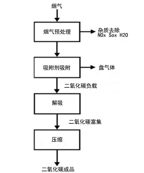二氧化碳的吸附技術(shù)的簡(jiǎn)化圖在圖二顯示。首先將煙氣中的水分,硫和氮氧化物凈化。然后,所制備的氣體進(jìn)入使用固態(tài)吸附劑的吸附階段,例如活性炭,沸石,金屬有機(jī)骨架,多孔聚合物,基于堿金屬和胺的碳酸鹽的固體材料,碳球等。之后,吸附劑進(jìn)入解吸階段,在此階段釋放出富含CO2的氣體混合物,然后在壓力下將其壓縮。該技術(shù)的優(yōu)點(diǎn)是二氧化碳萃取效率高,再生成本低以及吸附劑操作的穩(wěn)定性;钚蕴繉(duì)CO2和N2的吸附能力很高,具有不同于沸石的大比表面積,并且還可以在潮濕條件下工作。而且,活性炭比沸石具有更低的吸附熱,因此它們可以更容易地再生。因此,在25°C和1bar的溫度下,活性炭的吸附熱為3kJ,而沸石為30kJ。收集二氧化碳的吸附劑質(zhì)量的重要指標(biāo)之一是二氧化碳的吸附量。基本上,在靜態(tài)條件下和動(dòng)態(tài)條件下都進(jìn)行吸附容量的研究。