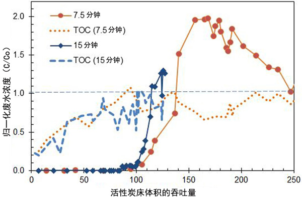 空床接觸時間對突破的影響說明如下:圖2用于123-三氯丙烷。盡管7.5分鐘和15分鐘EBCT的123-三氯丙烷突破的開始是相似的,但在100,000床體積之后,與7.5分鐘EBCT相比,15分鐘EBCT的突破更早。更長的EBCT容量降低可能是活性炭結(jié)垢的結(jié)果,這是由于更強(qiáng)的吸附力和不可置換的DOM到達(dá)吸附床的更深處,并超過了目標(biāo)有機(jī)物的吸附位點和/或覆蓋了活性炭顆粒的孔而導(dǎo)致的。時間并防止進(jìn)一步的目標(biāo)有機(jī)物吸附。通過比較相似突破點的吞吐能力差異,說明了EBCT對其他cVOC的活性炭性能的影響,其中負(fù)值表示在15分鐘EBCT時容量更大,正值表示在7.5分鐘EBCT時容量更大(或在15分鐘EBCT時容量較小)。床體積數(shù)量達(dá)到突破的10%,50%或75%的平均容量差異(不包括VC,因為未評估15分鐘EBCT)分別為-0.1%,9%和13%,表明在運(yùn)行時容量沒有損失。15分鐘的EBCT突破了10%,突破了適度的容量,因為更長的EBCT結(jié)垢了,因此突破了50%和75%。