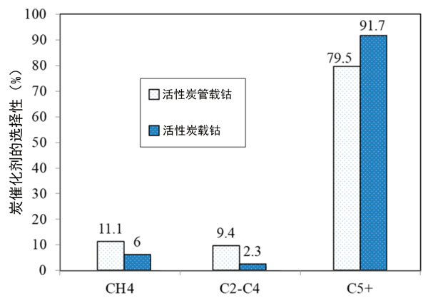 費托合成試驗是在210℃和2.5MPa的內(nèi)徑為12mm的不銹鋼固定床管式反應器中進行的。將0.5g催化劑與5.0g碳化硅稀釋劑的反應混合物裝入反應器中。催化劑在425℃下在N2中的33vol%H2中原位還原10小時。還原后,將反應器冷卻至180℃,并將H2/N2氣體混合物切換為合成氣(H2:CO為2∶1)。在合成氣加壓至2.5MPa然后在4小時內(nèi)重新加熱到210°C來完成反應;钚蕴枯d鈷催化劑,活性炭納米管載鈷催化劑的CO轉(zhuǎn)化率分別為13.1%,6.7%。產(chǎn)物選擇性的結(jié)果在圖2中給出。與活性炭管樣品相比,活性炭產(chǎn)生更高的C5+和更低的CH4選擇性,這對氣體產(chǎn)物(C1-C4)也產(chǎn)生最高的選擇性。