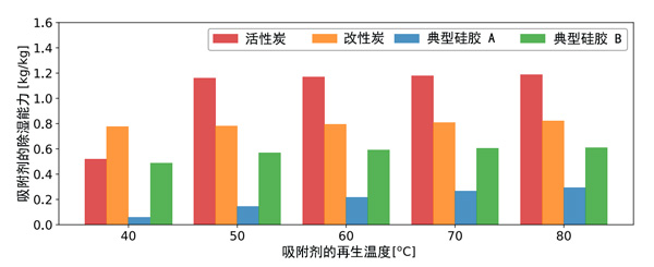 活性炭的除濕能力可以定義為在給定溫度和濕度條件下的有效吸附量,其計算方式為吸附與解吸之間的平衡吸附之差?紤]到實際環(huán)境條件,相當于室外空氣條件的吸附條件為干球溫度為32℃,相對濕度為80%。解吸條件是由再生空氣溫度從40℃到80℃給出的,室外空氣條件下的濕度比為24g/kg。計算出的除濕能力如圖1所示。比較了活性炭和典型硅膠(A型和B型硅膠)在不同再生溫度下的除濕能力。在硅膠的情況下,由于缺乏數據,吸附和解吸之間的磁滯被忽略了,并且預期它很小。